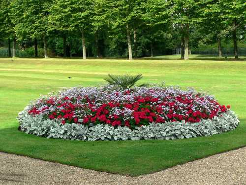 Стоит соблюдать правила гармоничной композиции клумбы: яркие и высокие цветы — в центре, среднерослые — в середине, а маленькие — по краям. Также, в клумбе можно высадить деревья и кустарники, акцентируя на них внимание.