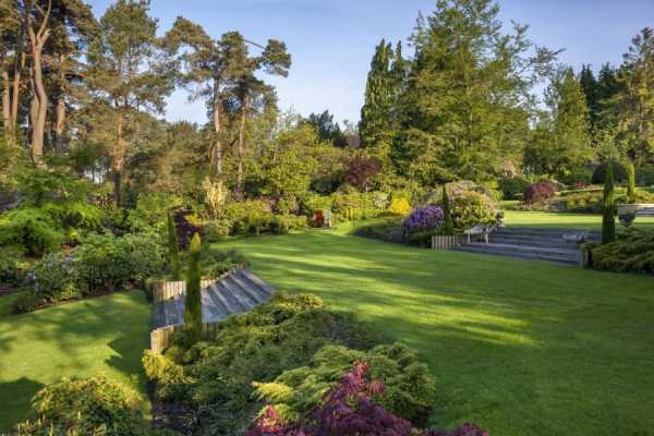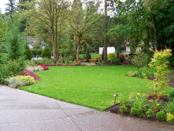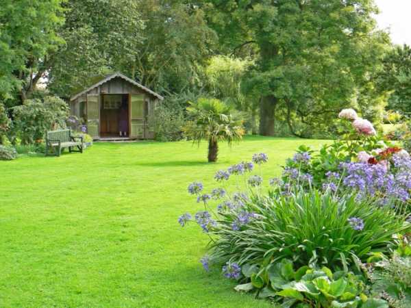 Сад, сочетающий в себе зеленые насаждения, цветы и большую свободную площадь, покрытую газоном