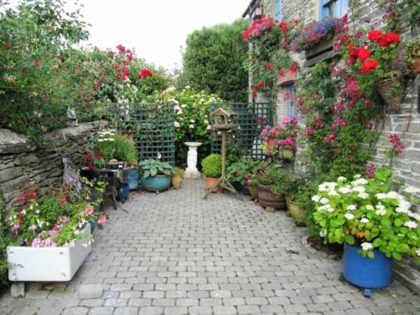 К примеру, вы можете посадить во внутреннем дворике полянку бархатцев, вынести на мощеную площадку кадки с пеларгониями и повесить на стойки веранды кашпо с махровыми петуниями — и дизайн внутреннего дворика готов.