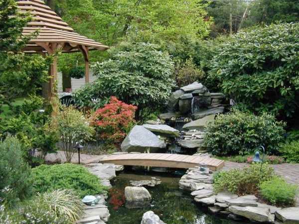 Мост, размещенный в саду, придаст цельность и стилистическую завершенность садовой композиции
