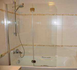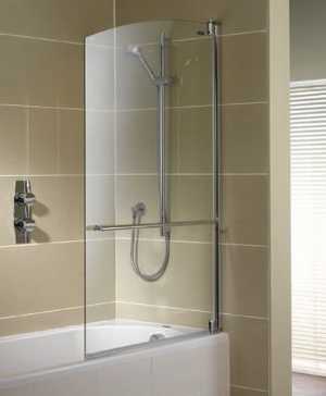 - Фиксированная шторка из стекла состоит из одной неподвижной части без открывающегося механизма. Такая конструкция просто фиксируется на бортике поддона и не заграждает всю ванну целиком.