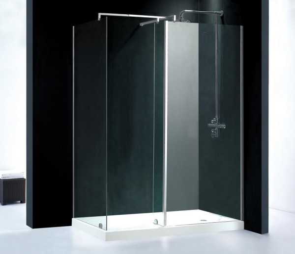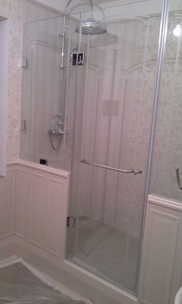 - Бескаркасные, из закаленного стекла. Для их производства используется ударопрочное стекло по толщине до десяти миллиметров. Стены и пол в ванной должны быть полностью ровные, чтобы вода не смогла протечь сквозь них.