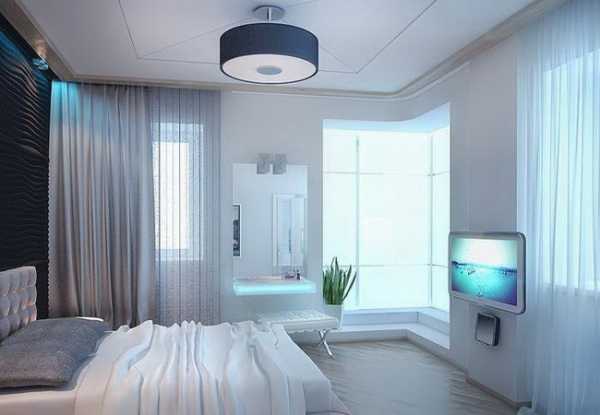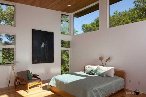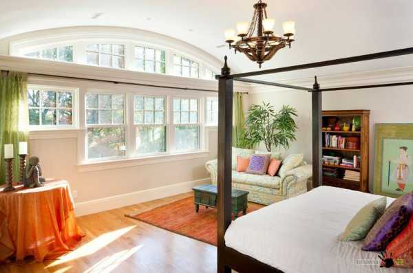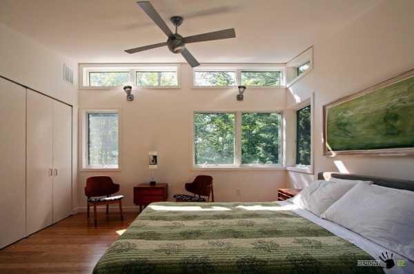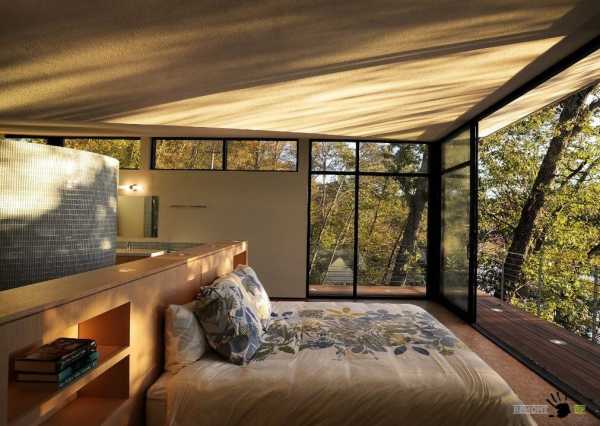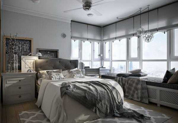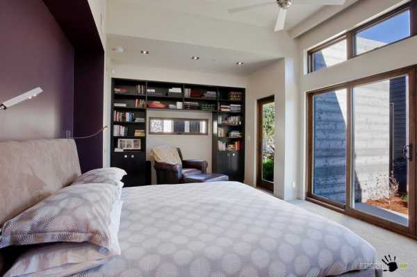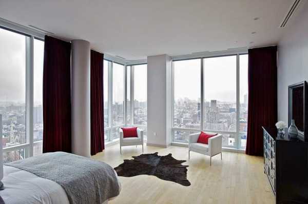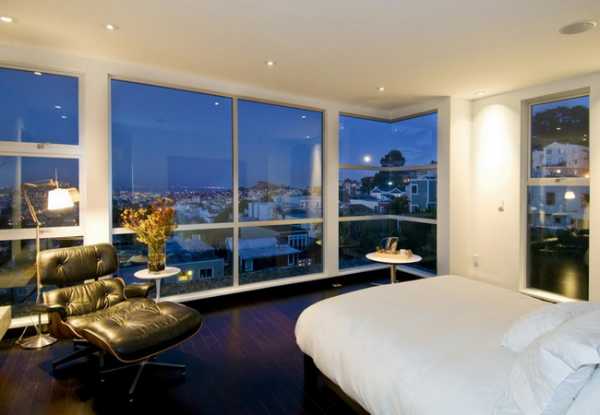 Угловые окна в спальне оценят те, кто любит наслаждаться светом звезд или вечерних огней перед сном, а по утрам – встречать первые лучи рассвета. Кровать в спальне можно поставить непосредственно в остекленном углу, а чтоб свет не казался слишком ярким, окна следует закрыть темными шторами. Оттенок штор подбирается в соответствии с цветовой гаммой помещения.