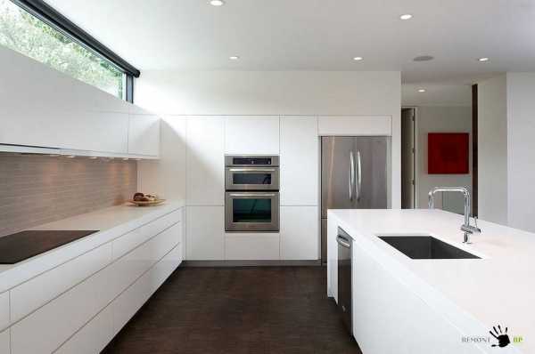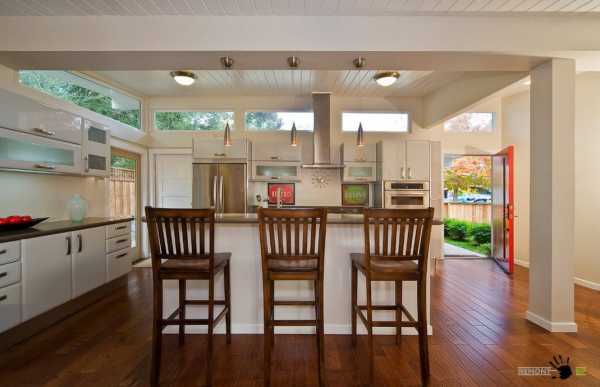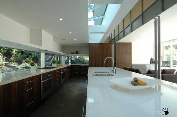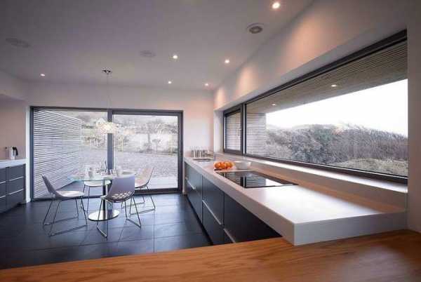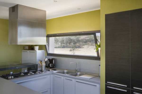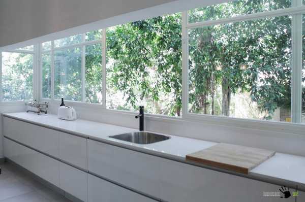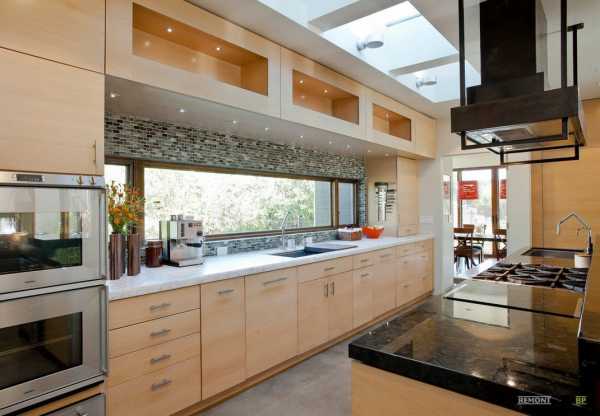 Существует вариант создания параллельного ленточного остекления, при котором не нужно будет жертвовать верхним ярусом кухонных систем хранения. Безусловно, такой вариант обогащения кухни естественным светом подходит для помещений с достаточно высокими полками.
