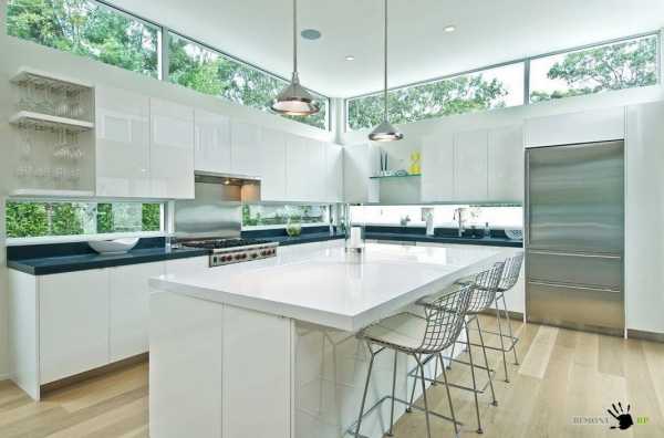 В последнее время в дизайн-проектах кухонь часто можно заметить ленточное остекление, которое служит фартуком (или его частью), располагаясь над рабочими поверхностями кухонного пространства. Среди очевидных преимуществ такого расположения оконных проемов можно отметить высокий уровень освещения самых важных зон кухни, не говоря уже о том, что готовить вкусное блюдо или мыть посуду гораздо приятнее, если есть возможность смотреть на отличный вид природы за окном.