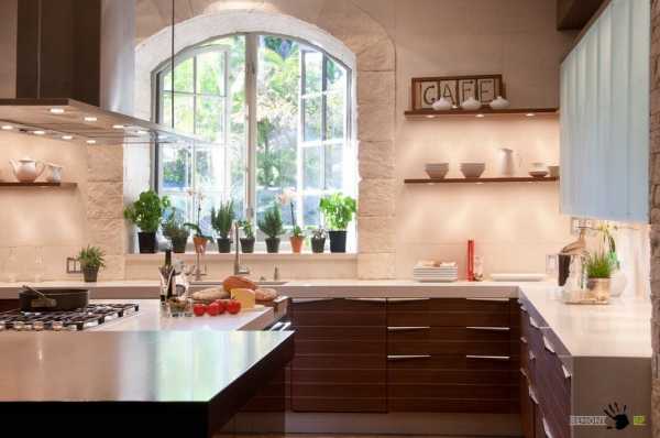 Иногда угловое окно на кухне выполняет функции фартука. В подобном случае полки для приправ и специй можно навесить над окном, где доступ к ним всегда будет удобным и быстрым. Стоит отметить, что окно вместо фартука – довольно практичное решение, поскольку за стеклянной поверхностью проще всего ухаживать.