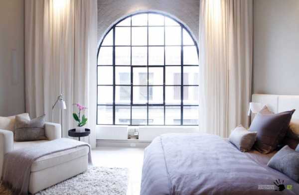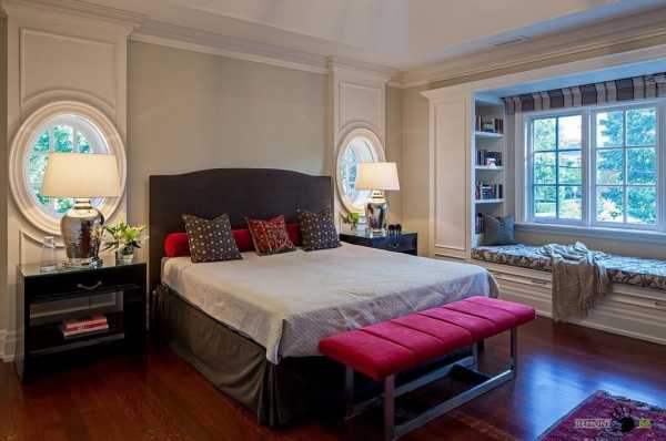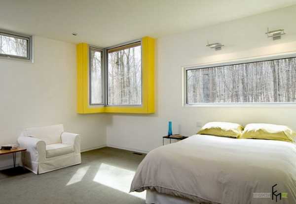 В спальне, оформленной в светлых тонах, угловое окно станет броским акцентом. Выделить его можно с помощью рамы яркого оттенка.