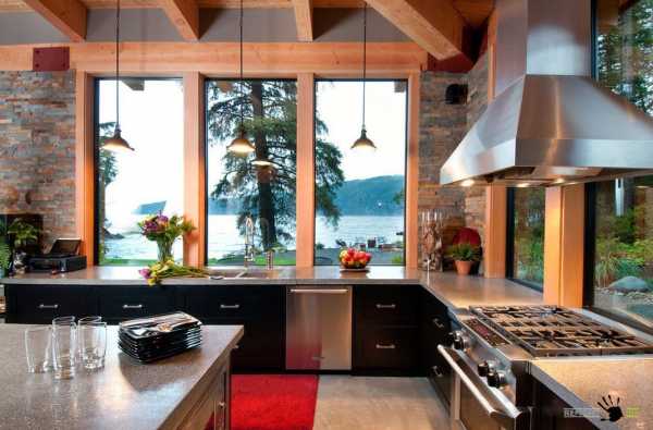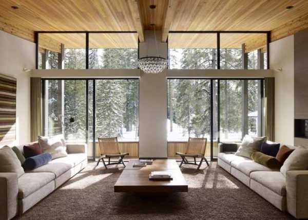 Панорамные окна не только украшают обстановку, но и невероятно смотрятся с улицы. Имеет смысл делать остекление на всю стену, только если за домом с большими окнами будет потрясающий вид.