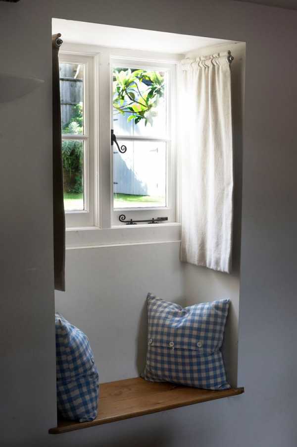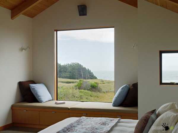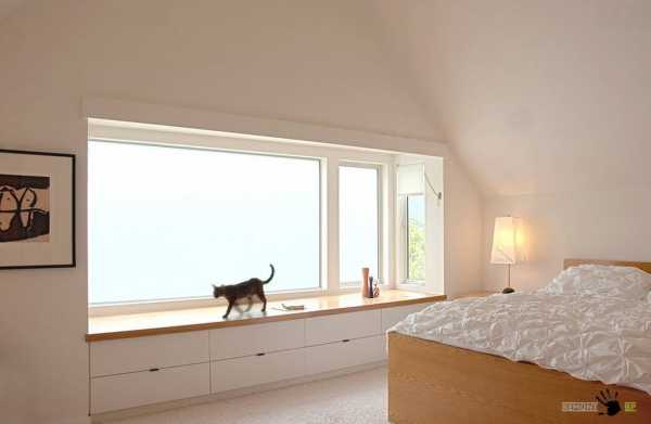Под угловым окном можно расположить и функциональную зону, например, поставить там диванчик с подушками. Чтоб лишнее пространство не пропадало даром, внизу оборудованы ящички для хранения небольших вещей.