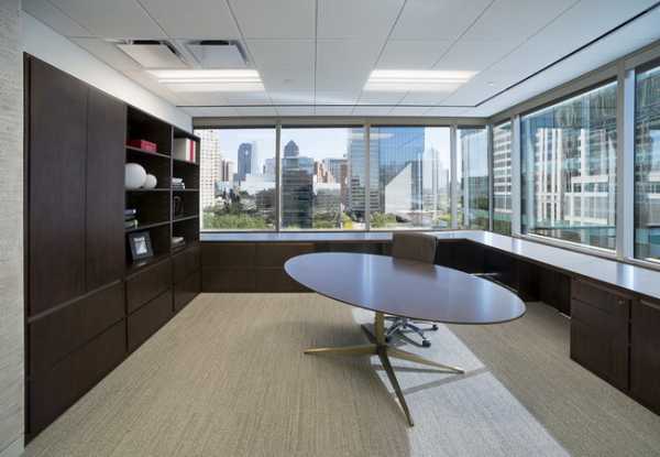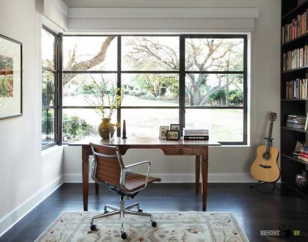 Сложно придумать более удачное решение, чем угловое окно в кабинете. Вариантов оформления такой комнаты можно придумать целое множество. К примеру, под окном можно расположить небольшую софу или диван, где будет удобно отдыхать в перерыве между делами. Свет из окна позволит расслабиться и почитать интересную книгу или газету.