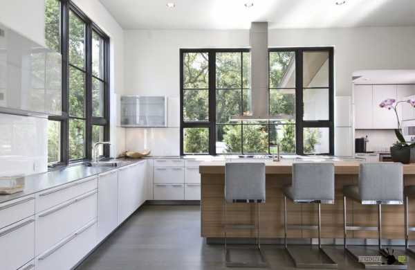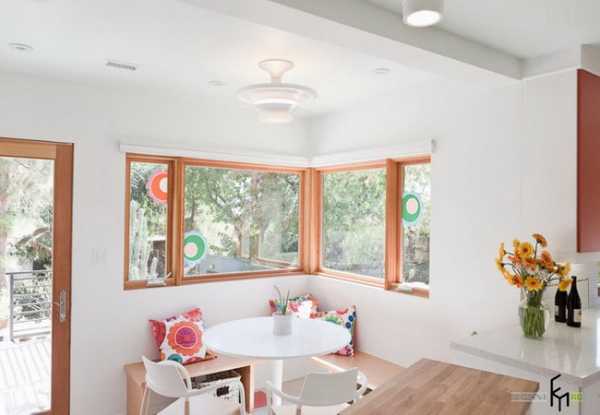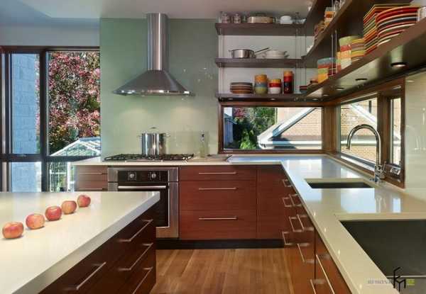 Угловые окна на кухне не только являются декоративным элементом дизайна, но также выполняют практические функции. Благодаря хорошему естественному освещению, под окнами можно расположить рабочую зону. Если мойка размещается непосредственно в углу с окном, по обе стороны от нее желательно поставить плиту и стол для готовки.