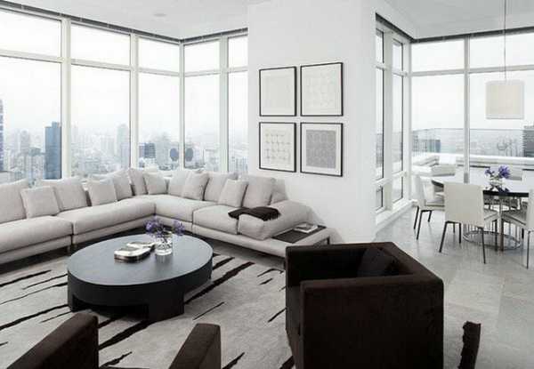 Гостиная – место для встречи близких и друзей. Напротив углового окна можно поставить большой стол, за которым будут собираться шумные компании гостей. Этот стол вместе с оригинальным окном станет центральной частью интерьера и любимым местом всей семьи