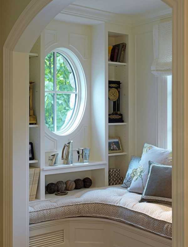 Напротив углового окна можно поставить уютный шезлонг, а рядом оборудовать книжные полки. В таком месте будет удобно читать, а также просто наслаждаться солнечными ваннами в теплый погожий день.