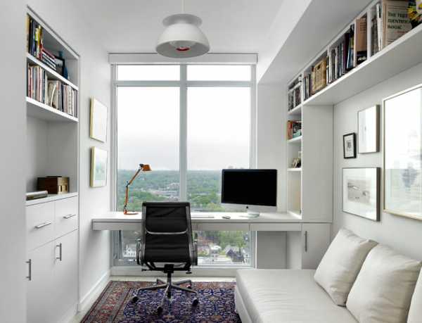 В углу с окном довольно удачно может расположиться рабочая зона, тем более что освещение в этой части комнаты наиболее яркое. Рабочие столешницы можно разместить непосредственно под окнами, вдоль стен. Чтоб сэкономить пространство и не отягощать его громоздкими шкафами, повесьте несколько полочек для документов, книг и прочих аксессуаров прямо над рабочими поверхностями. Не забудьте оборудовать зону светильником или лампой, которые пригодятся в темное время суток.