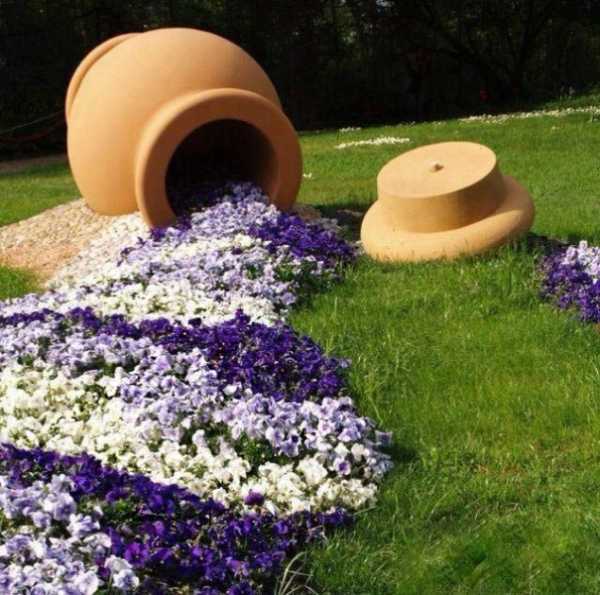 Делают небольшое углубление в земле, тем самым укрепляют вазон. Наполняют его землей. По мере опускания склона готовят участки, которые и будут имитировать ручей. Для этого используют цветы с яркими оттенками, чтобы они выделялись на общем фоне газона.