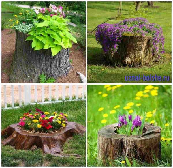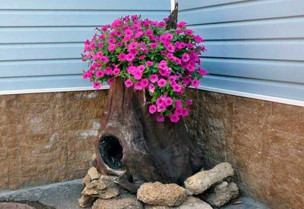Оригинально можно украсить даже пень, и он в солнечный день порадует изобилием красок.
