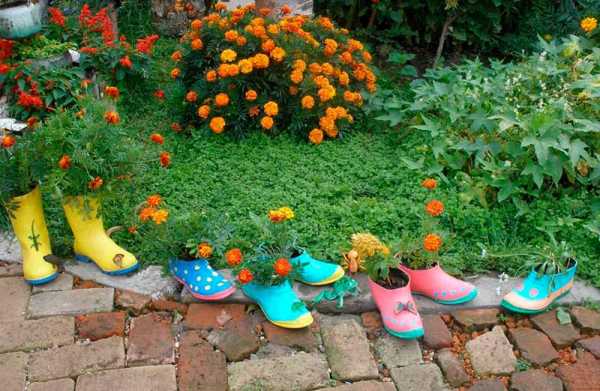 Контейнерные клумбы представляют собой мини-композиции цветов, высаженных в самые разные емкости и формы, не предназначенные для садоводства. Существует множество вариантов превращения подручного материала в оригинальный дизайнерский элемент из цветов: