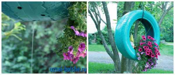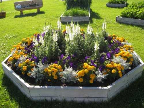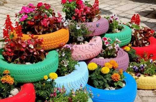 Цветочные клумбы своими руками могут быть высажены на старых покрышках, деревянной или пластмассовой емкости, изготовленных из цемента, камней, либо другого материала цветников.