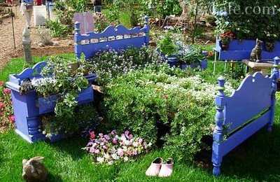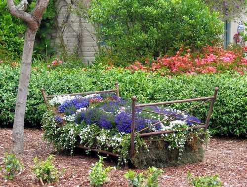 Вы удивитесь, но в качестве клумбы можно использовать старый велосипед, каркас неисправного автомобиля, повозку, таратайку, заброшенную ржавую постель.