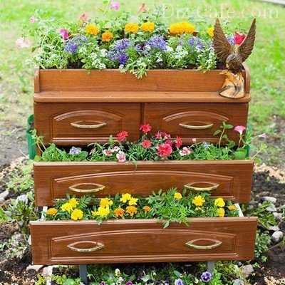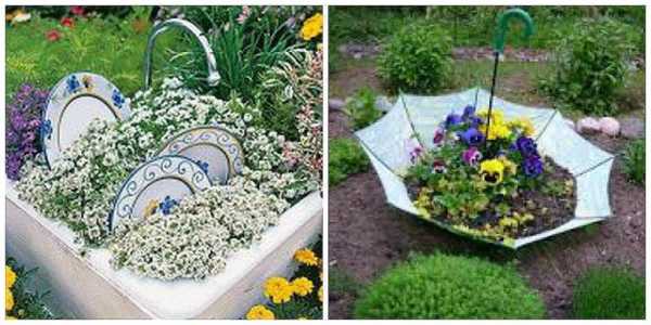 - для обустройства большой клумбы возможно использование такого подручного материала: ящиков от мебели, корыт, тазов, старых ванн, тележек – из чугунной ванны на даче можно оборудовать оригинальный водоем;