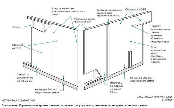 Как вариант, пока OSB с уличной стороны дома не будет защищён финишным материалом с нормальными гидроизоляционными способностями, на швы могут быть закрыты при помощи реек-нащельников или вообще оформляться в виде горизонтального соединения плит с перехлёстом от 40 мм.