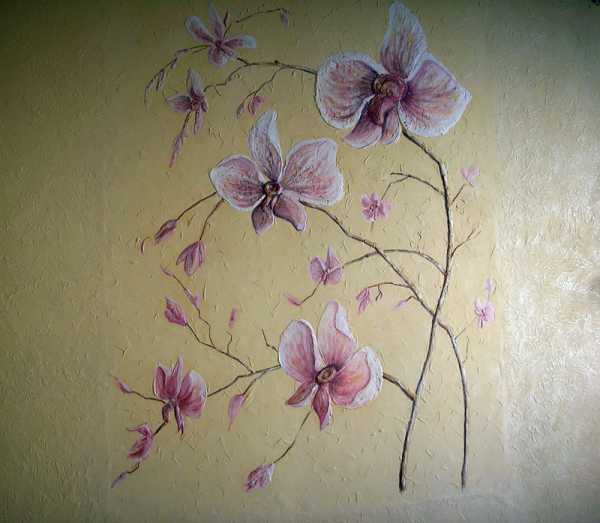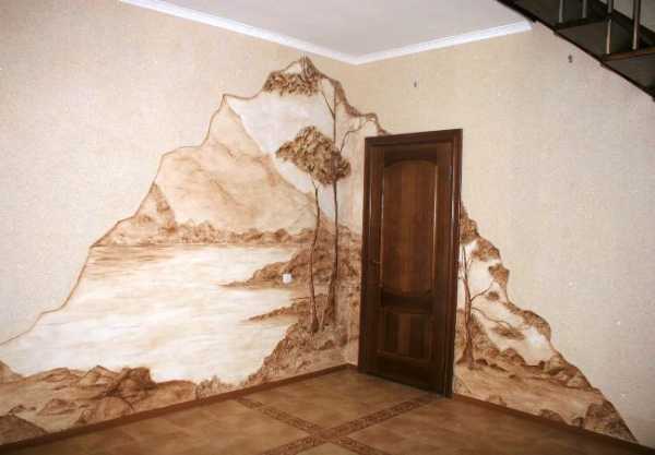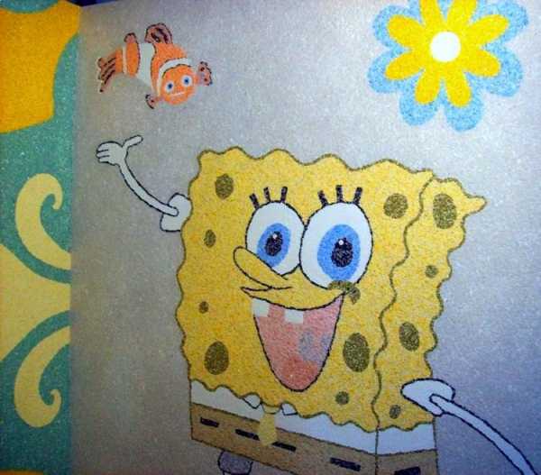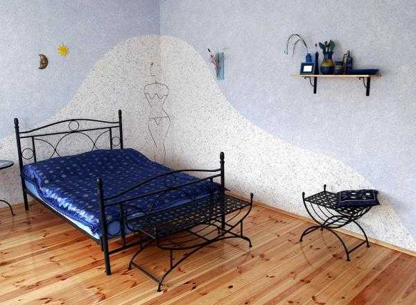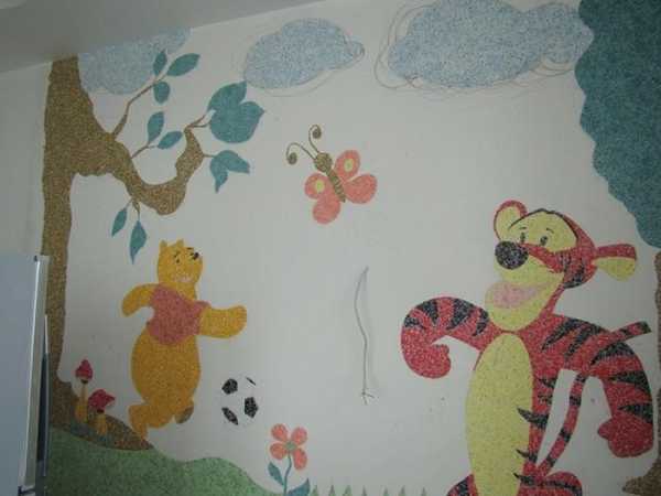 - Попробуйте создать рисунки на стенах. Удобнее всего для этого использовать объёмные трафареты, хотя если вы обладаете художественными способностями, то сможете сотворить изображение и своими руками, буквально вылепив его из обойной массы. Но помните, что узор должен полностью высохнуть, и только потом можно продолжать отделку.