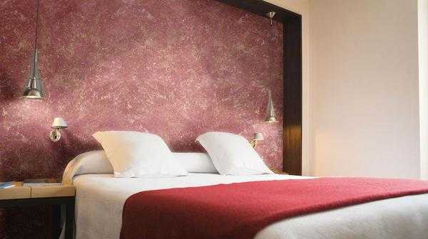 - Выделите одну из стен, оформив её с помощью жидких обоев другого цвета, отличающегося от основного. Причём этот оттенок может как сочетаться с фоном или относиться к той же гамме, так и быть контрастным и за счёт этого выделяться, создавая яркий акцент.