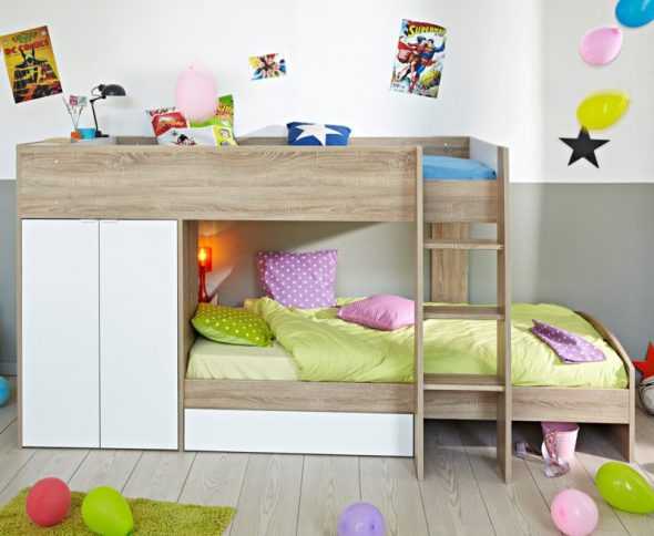 - Двухъярусная кровать с выдвижным спальным местом, что позволяет разместить троих детей, не приобретая еще одну кровать и не загромождая небольшое помещение.