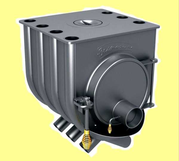 Загрузочная дверца расположена в центре печи. Снизу находится прочистная дверца и зольник. В верхней части — дымовая труба. Печка оснащена водяным контуром с патрубками для входа и выхода воды. Такой печью с водяным контуром можно достаточно эффективно отапливать небольшие дома и другие помещения, и сделать ее можно из подручных материалов своими руками.