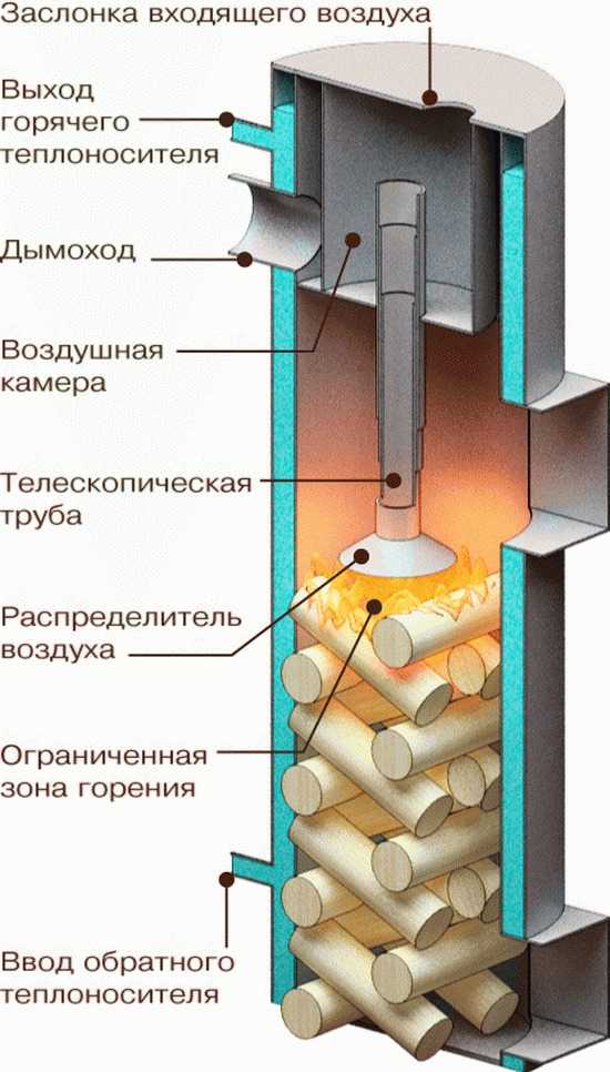 Печи длительного горения имеют особенности конструкции. Они состоят из двух камер или зон горения, в одной из которых происходит пиролиз дров, а в другой — дожигание дровяных газов. Расположение камер относительно друг друга может быть различным.