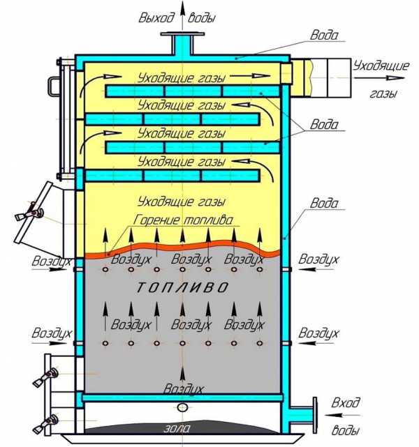 - Летучие вещества поступают в камеру сгорания, туда же подается часть воздуха, не использованного ранее, и газы сгорают с образованием высокой температуры.