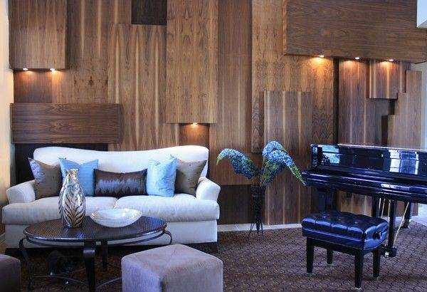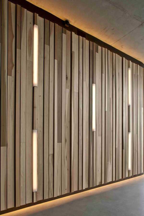 Кстати, панели под дерево в интерьере смотрятся элегантно, если расположить их под разными углами и выстроить из них несколько уровней. Если же добавить к ним несколько элементов из световых панелей, стена приобретет объем и будет выгодно выделяться на фоне общей картинки.