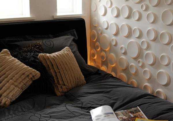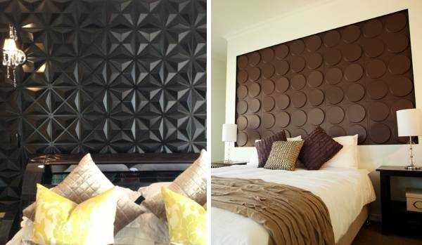 Некоторые изделия производители обтягивают натуральной или искусственной кожей, тканью, однотонной эмалью или шпоном. Такие 3д панели в интерьере спальни создают невероятную атмосферу уюта и теплоты домашнего очага.
