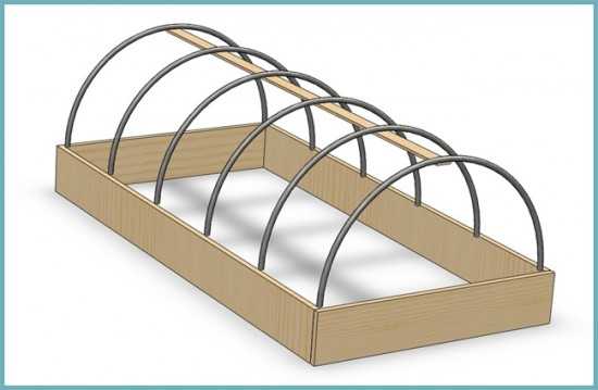 - В деревянном каркасе просверлите отверстия для дуг. Соблюдайте между ними расстояние в 50–60 см.