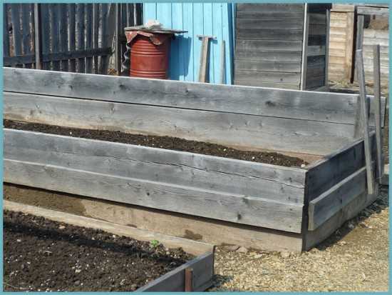- По периметру грядки установите деревянные доски, которые послужат основой каркаса. Их ширина должна быть такой, чтобы доска, положенная на ребро, возвышалась над почвой на 20 см.