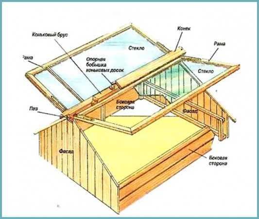 Для изготовления короба можно использовать кирпич, шифер или доски. С внешней стороны стенки засыпают торфом, чтобы обеспечить достаточный уровень теплоизоляции. Иногда в качестве стенок выступают тюки прессованной соломы, обладающие хорошими теплоизоляционными характеристиками и не препятствующие движению воздуха. После того как короб будет изготовлен, укладываем сверху старые оконные рамы.