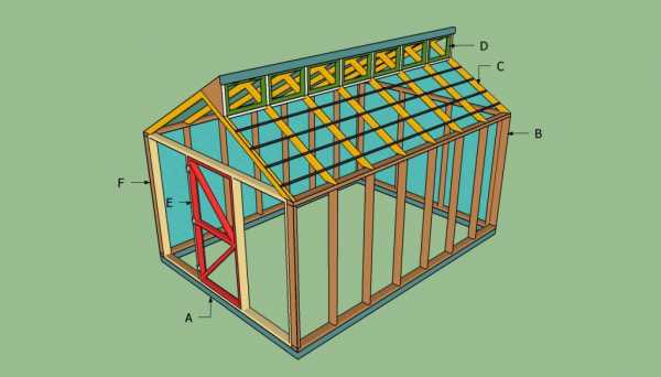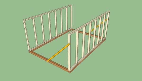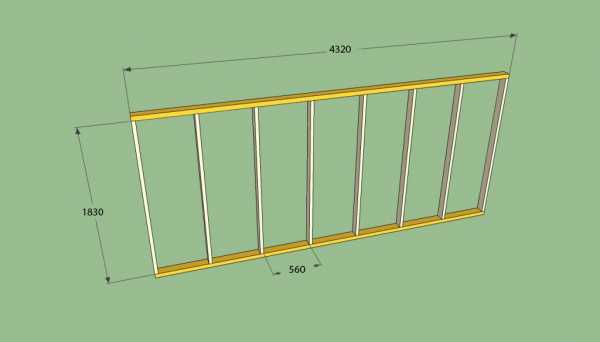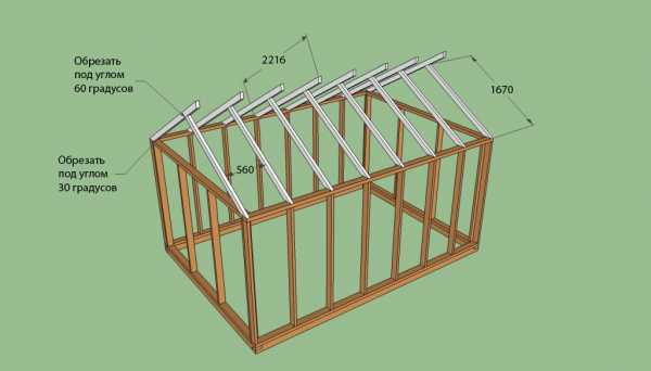 - Те части конструкции, которые несут функцию стропил, изготовьте из бруса с сечением 100Х50 мм. Зафиксируйте стойки относительно друг друга продольными элементами, положив их на боковые плоскости.