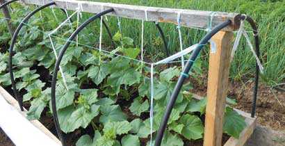 Рейки для опоры каркаса прибивают к выступающим частям короба. Дуги для теплицы делают из проволоки диаметром 4-6 мм длиной. Расстояния должно быть достаточно для того, чтобы человеку, выращивающему огурцы под пленкой, было комфортно там работать. В среднем достаточно 1,5 м. Затем по длине всей теплицы расставляют дуги, сверху их скрепляют проволокой. Начинать работу надо с краев, а заканчивать в центре. Теплица под огурцы готова, остается только покрыть ее выбранным верхним материалом.