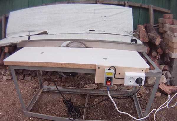 Сверху металлического каркаса крепится рабочий стол из широкой доски или толстой фанеры. По нему будет передвигаться обрабатываемая деталь. Упорный уголок снабжен подвижным креплением для регулировки ширины распила.