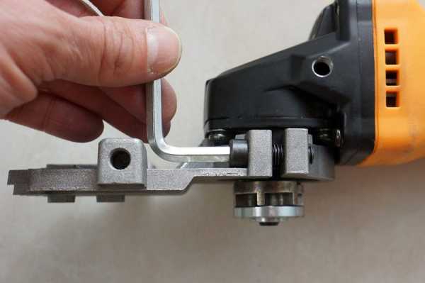 - В корпусе редуктора имеются резьбовые отверстия для крепления штатных рукояток. С помощью уголков и этих отверстий болгарку нужно прикрепить к подвижной части станка.