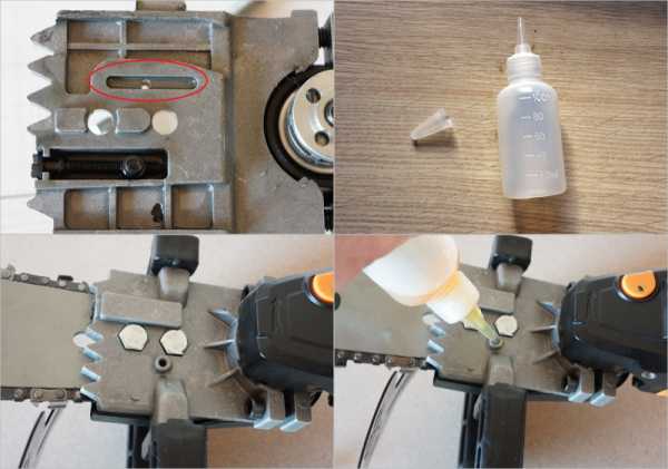 Комплектной «масленкой». Такое впечатление, что производитель вспомнил о необходимости смазывать цепь в самый последний момент, т.к. емкости, для какого-либо мало мальского количества масла, в конструкции не предусмотрено. Масло заливается через малюсенькое отверстие, а где оно «храниться» я выделил красным овалом: