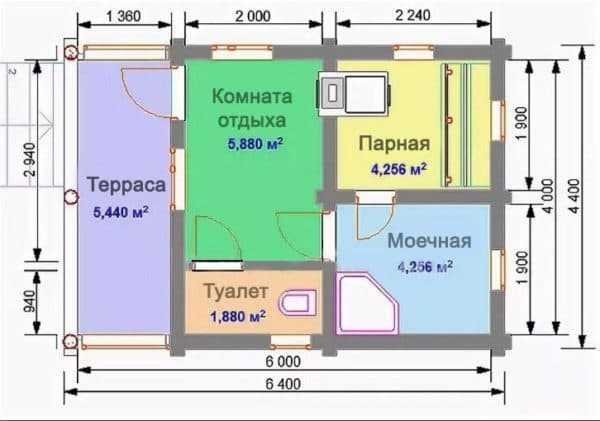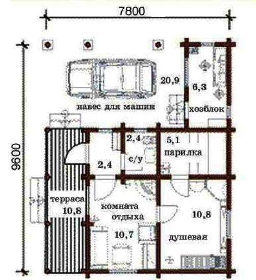 В комнате отдыха 5, 8 кв. м умещается стол со скамьями и холодильник. Терраса открытая. В бане устраивают отдельно мойку и парилку. Сауна – стандартная, со скамьёй 60х1900 см. В моечной 4, 256 кв. м размещается душ с трапом. Возможно установка купели габаритами 1000х1700 мм. Санузел в планировке выглядит миниатюрным, однако тут умещается компактная мойка и унитаз.