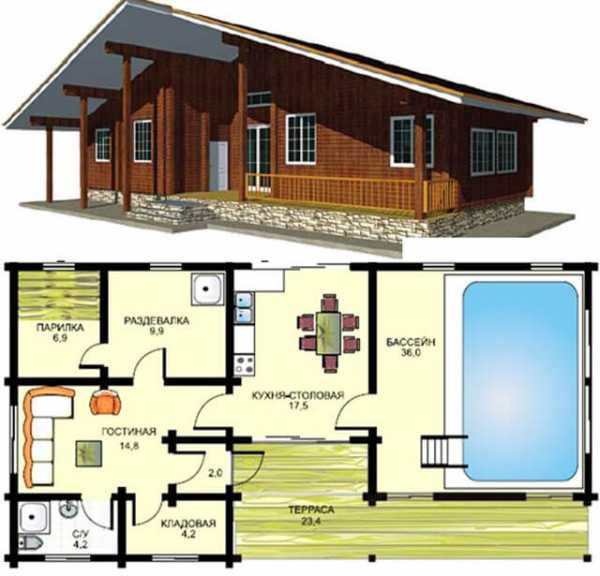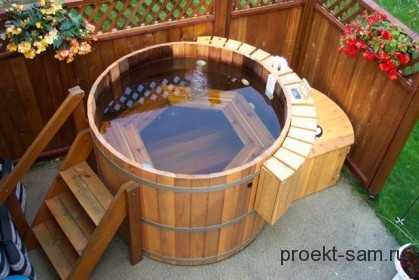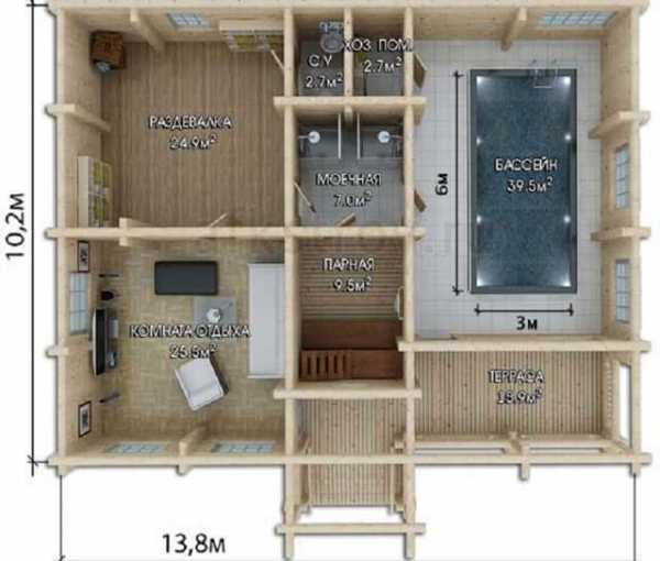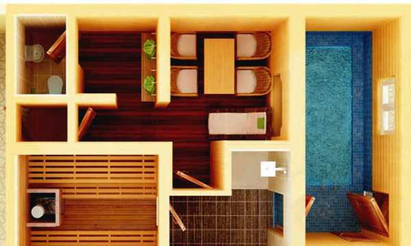 - Бассейн. Нужно учитывать, что длина и ширина искусственного водоёма, комфортного для плавания – 5,5х2,25 м. В саунах габаритами 6х6, 6х4, 6х3 легче и проще установить купель.