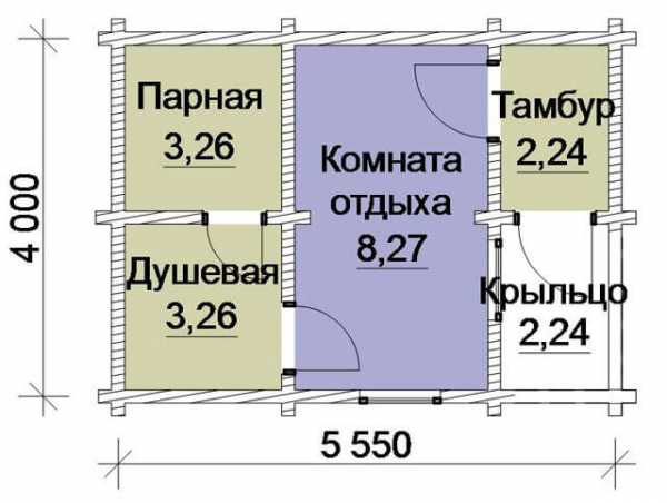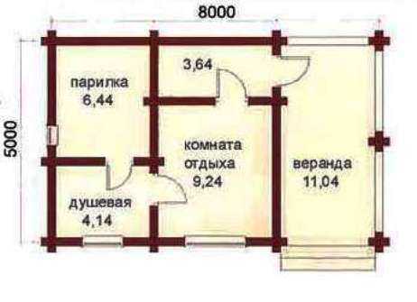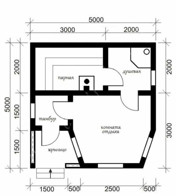 Баня 5 на 5 имеет уже приличную площадь, поэтому в этом случае нет смысла объединять парную и моечную. Планировка предусматривает парную 2х3 м, небольшую душевую – 2х2м, просторную комнату отдыха, маленький тамбур и даже крыльцо.