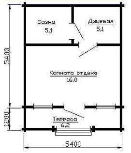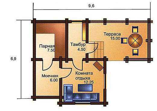 Баня 6 на 7 – это вариант для большой компании. Здесь имеются просторная комната отдыха (15,35 кв. м), небольшие парная, душевая, тамбур и терраса.