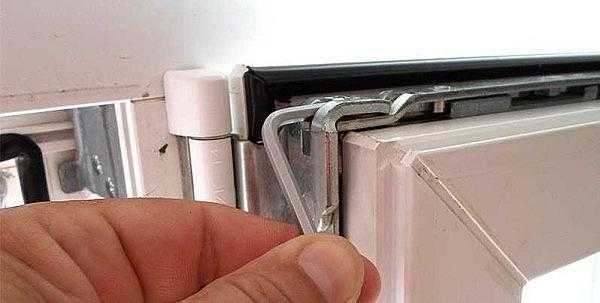 После локализации места смещения нужно заняться устранение перекоса. Петля в нижней части регулируется как по вертикали, так и по горизонтали. Аналогичным образом можно подрегулировать и верхний механизм. В качестве инструмента обычно используют ключ-шестигранник на 4. Иногда в дело идет отвертка-крестовина или особый ключ-звездочка, вложенный в комплект поставки окна.