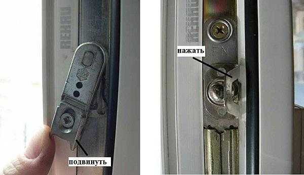 Иногда и эта регулировка не помогает. Тогда требуется прижать верхний угол к раме. Для этого есть другой винт на поворотно-откидном механизме. Чтобы был доступ к этому винту, придется открыть окно сразу в двух положениях. Для этого створку открывают, прижимают блокиратор. Он обычно бывает двух конструкций в виде запорной петли или язычка (смотрите на фото ниже).