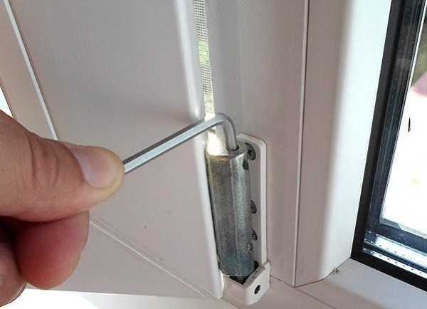 Если винт у верхней петли не помог, то необходимо отрегулировать еще один узел, который расположен в зоне пластины откидного механизма, удерживающей окно в наклонном положении. Для этого створку открывают и, удерживая блокиратор, откидывают, получая доступ к пластине в верхней части окна. Далее в головку винта вставляют ключ и вращают на четверть оборота по часовой стрелке или в обратном направлении.