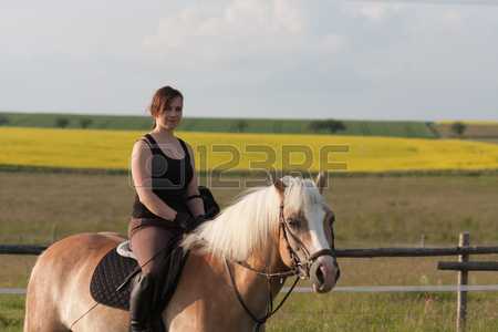 #76058761 — A young woman posing on a horse, horse breed Haflinger.