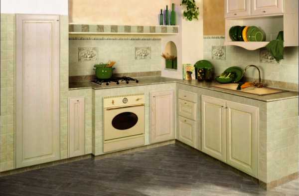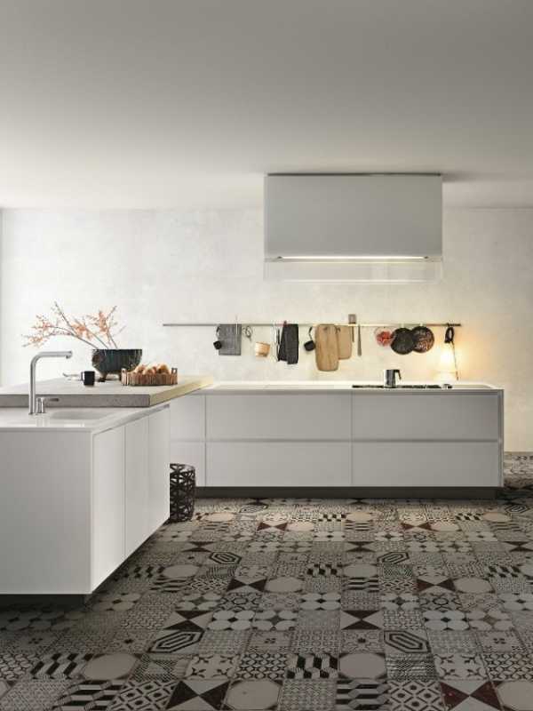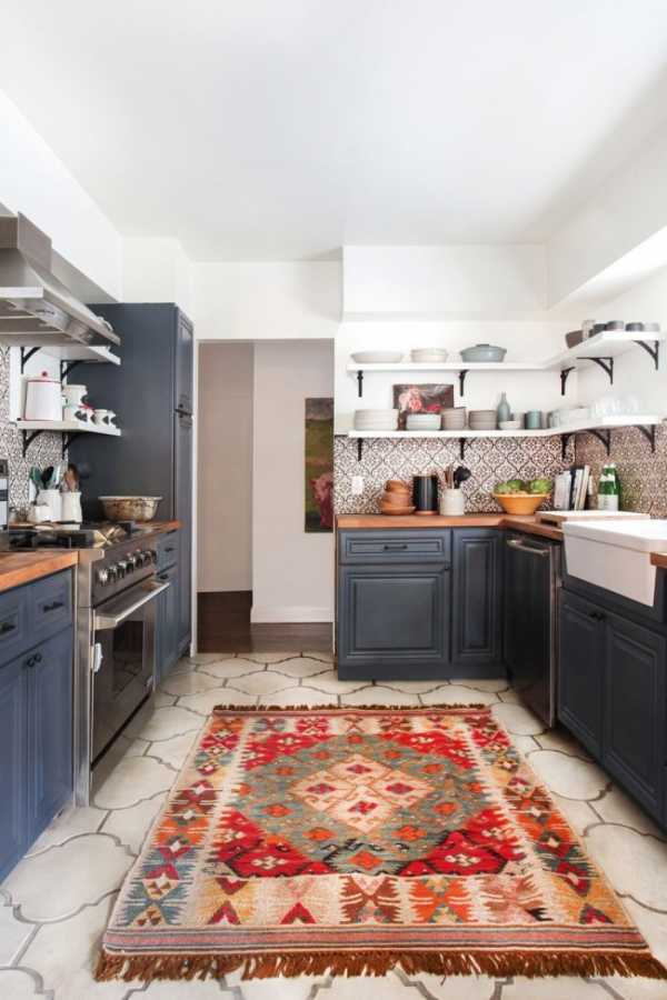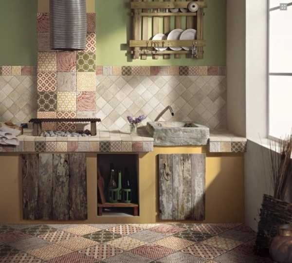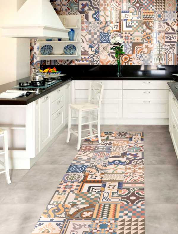 А плитка с геометрическим узором, где линии закруглены на углах, придаст интерьеру мягких ноток — это уместно, там, где четкие линии не требуются или даже противопоказаны. К примеру, некоторой небрежности требуют славянский стиль, средиземноморский, восточный. Такая кухня не должна выглядеть слишком строгой — желателен даже эффект «потертости», словно помещение уже давным-давно обжито и используется.